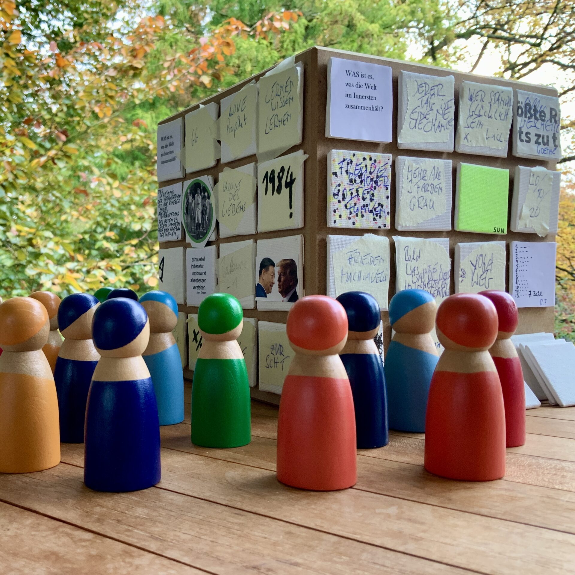 Das obige Foto zeigt einen Holzwürfel als Demostrationsobjekt in den Maßen 20x20x20 cm mit einigen ersten Entwürfen der beteiligten Kunstschaffenden.